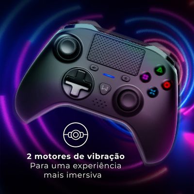 Seu design ergonômico se adapta com facilidade às mãos, garantindo firmeza e conforto mesmo nas partidas mais intensas. Com dois motores internos de vibração, o controle oferece resposta tátil que aumenta a imersão em jogos de ação, aventura e esportes. Já o Touchpad integrado e a iluminação adicionam funcionalidade e estilo ao setup.