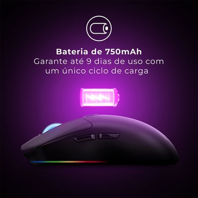 Com bateria de 750mAh, garante até 9 dias de uso com um único ciclo de carga. Acompanha cabo de carregamento USB-C de 1,5m, que permite usar o mouse mesmo enquanto carrega.